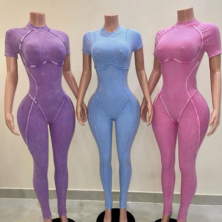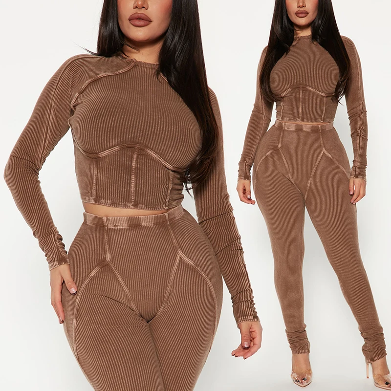 Huili Acid Washed High Stretch Matching Sets Custom Logo Bodysuits 2 Piece Slimming Yoga Running Ribbed Activewear for Women